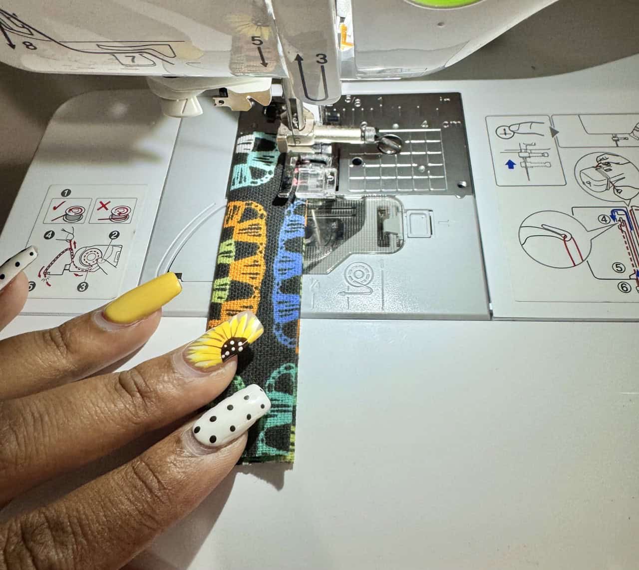 7) Make straps: Fold short ends under ½”. Fold long sides in by 1” and hold in place using the Clover Wonder Clips, then in half. Edgestitch both sides of the strap. Pass the strap through the slider, then through swivel hooks. Fold 1/2” of the end back and secure with stitching or a rivet. I made the holes for the rivet using an awl.