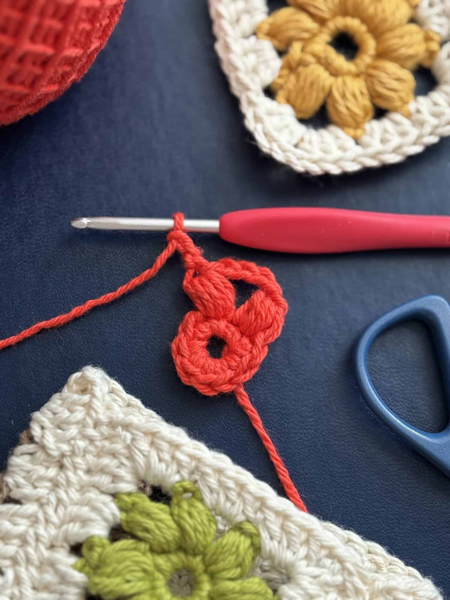 - Round 2: Pull up and loosen your yarn a bit (to about a half inch), yarn over and insert your hook into the same st, pull up a loop to the same height, repeat 3 more times giving you a total of 9 loops on your hook, ch 1 tightly to fasten st (one puff st completed), ch 4, *(yo, pull up loop in next sc to ½”) 4 times, yo and pull through all 9 loops, ch 1 tightly, ch 2, puff st in the next st, ch 4; repeat from * 2 more times, making a puff st in the last sc, ch 2, sl st to the top of the first puff st. (8 flower petals, 4 ch 5 spaces, 4 ch 3 spaces).