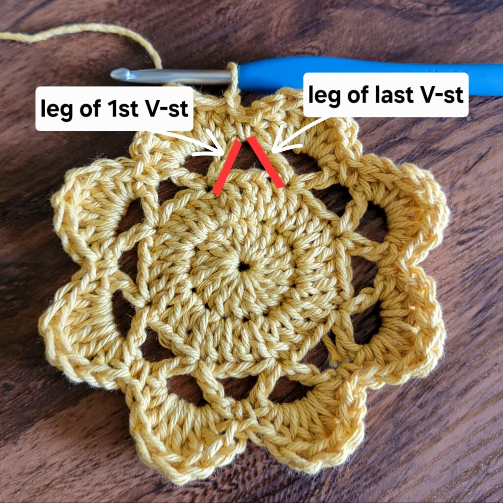 - V-st: V stitch—(1DC, ch3, 1DC) all in the same stitch or space