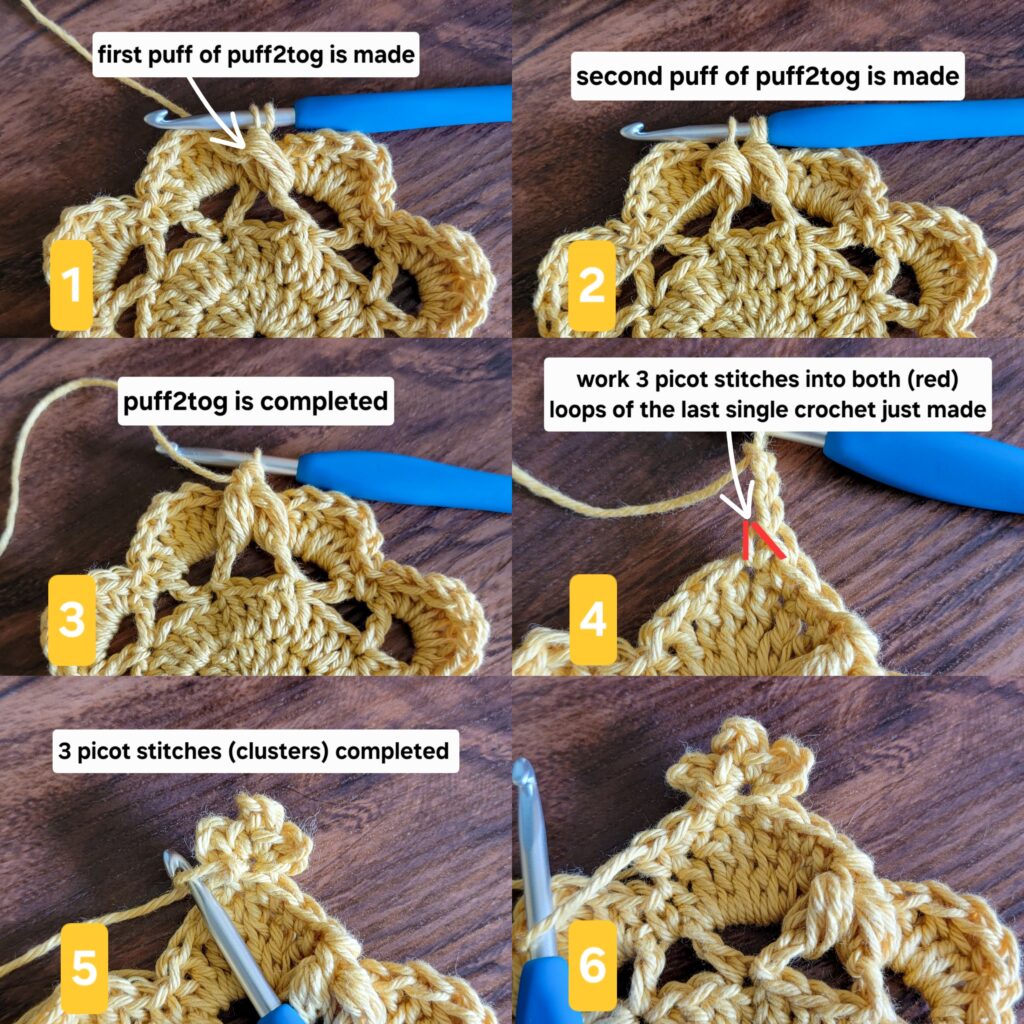 - puff2tog: puff 2 stitches together—yarn over, insert your hook into the first stitch indicated, and pull up a loop to the height of your current round. Yarn over again, insert your hook into the same stitch, and pull up another loop—two times, 7 loops on your hook. Yarn over and pull through 6 loops—2 loops on your hook (the first part of the puff stitch is made). Yarn over, insert your hook into the next stitch indicated, and pull up a loop to the height of your current round. Yarn over again, insert your hook into the same stitch, and pull up another loop—two times, 8 loops on your hook. Yarn over and pull through 6 loops—3 loops on your hook (the second part of the puff stitch is made). Yarn over and pull through all 3 loops to complete both stitches together into one.