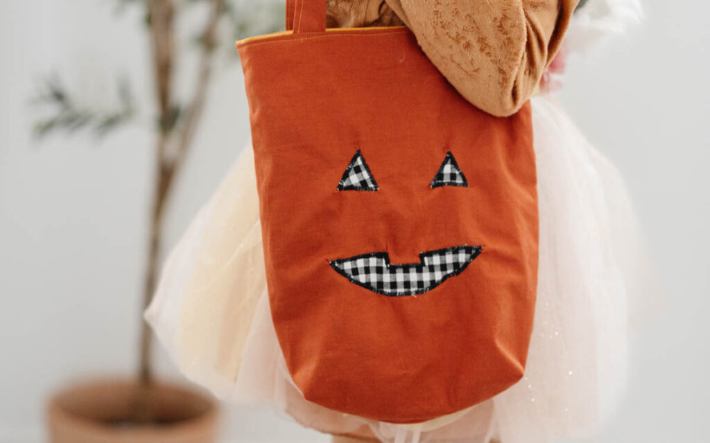 She traced the pumpkin face details onto the black gingham fabric using Water Erasable Tracing Paper and the Double Tracing Tool. Then, she used scissors to carefully cut out the eyes and mouth shapes before sewing them onto the bag.