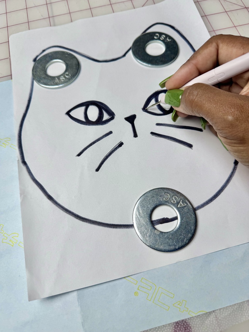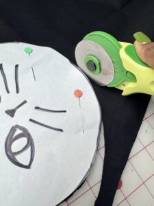 1) I found an image of a cat that I liked and I traced it. You can also freehand it! A circle and two triangles for ears would also suffice if you can’t find an image you would like to use. Feel free to use the pattern I provided in the materials! This is a great time to also trace the cat eyes, the cat nose, and cat whiskers onto the interfacing using the Clover Water Erasable Tracing Paper and Clover Double Tracing Tool.
