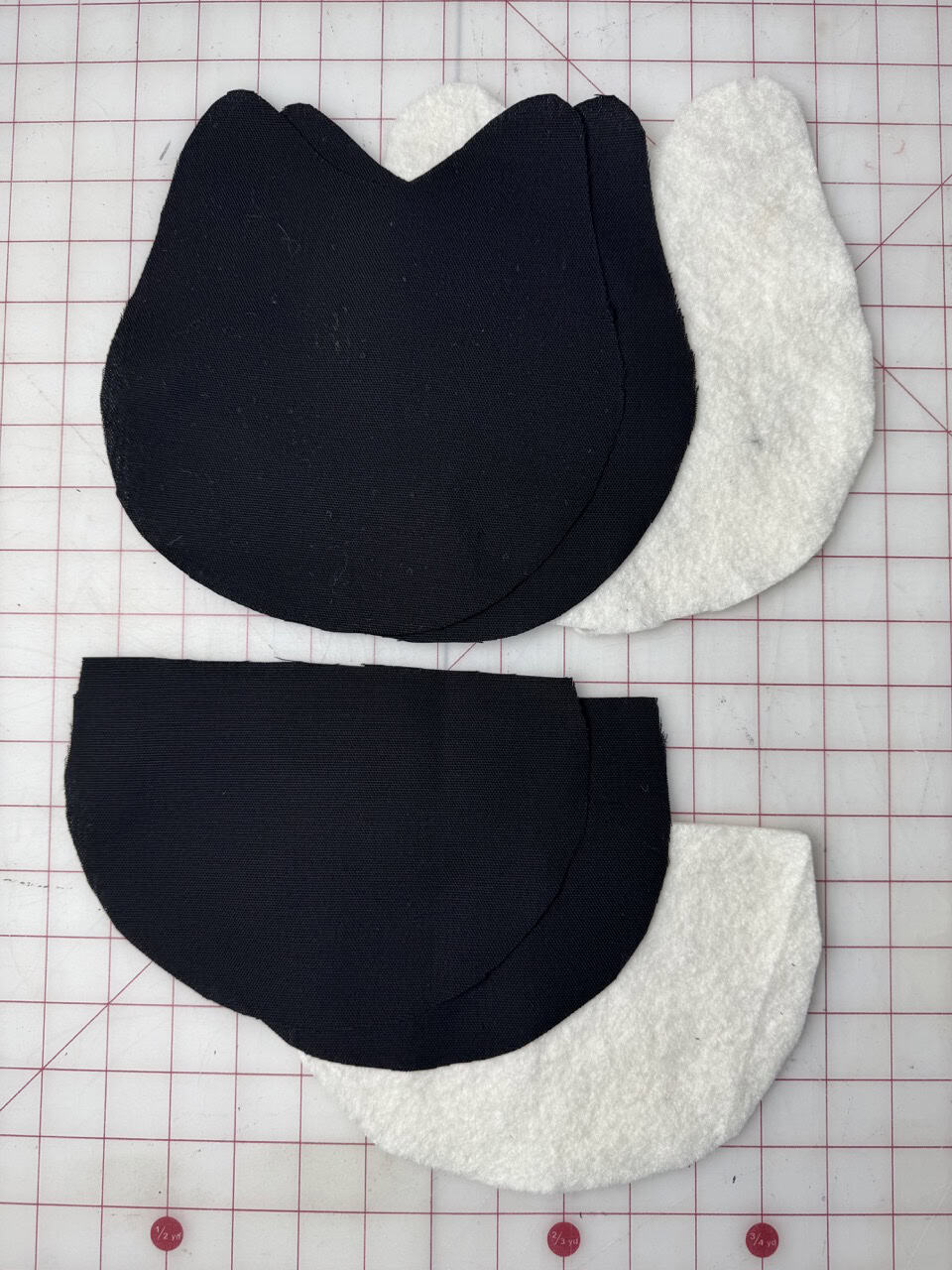2) Cut two pieces of the cat pattern (piece A) with the black fabric and one piece of batting and two pieces of the bottom half of the cat’s face (piece B) and one piece of batting to match. If you prefer a thicker potholder, layer two pieces of batting together. I cut my fabric using the Clover Rotary Cutter (60 mm) for smooth cuts and it does a great job at round edges.