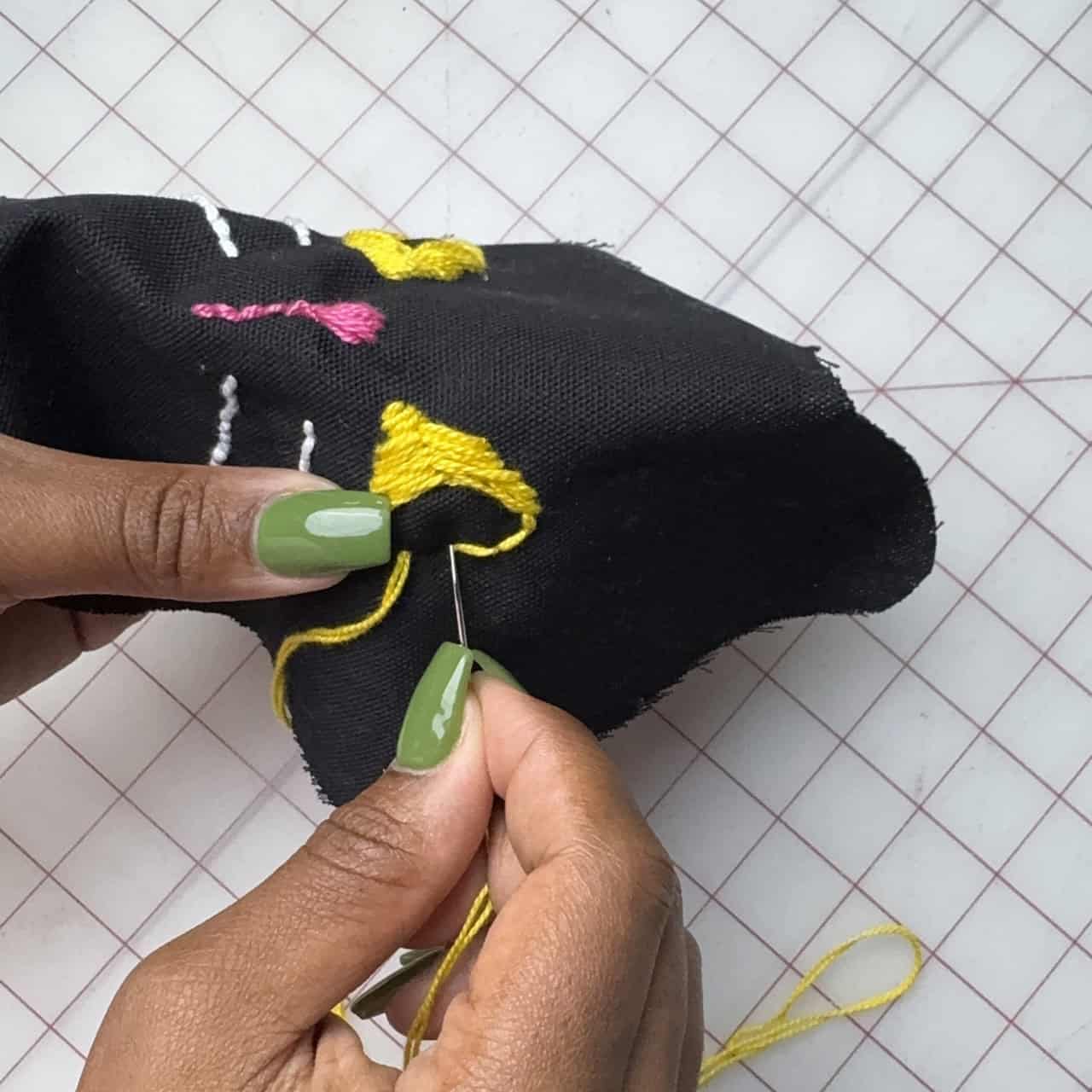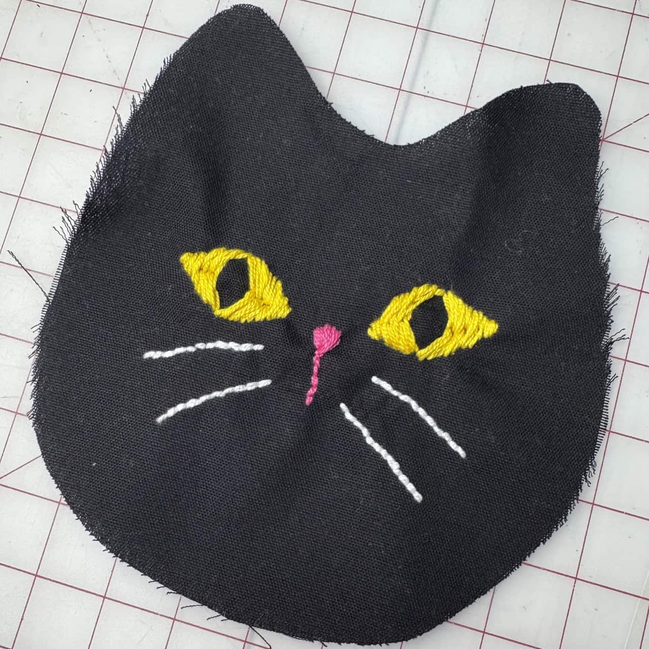 3) Before assembling, place the traced cat face onto the wrong side of one of the black cat pieces. Using Clover Embroidery Needles and Clover Darning Yarn, add the whiskers, the eyes, and the nose following the tracing guidelines. I used a backstitch to create the cat’s face. This adds both texture and a handmade touch.