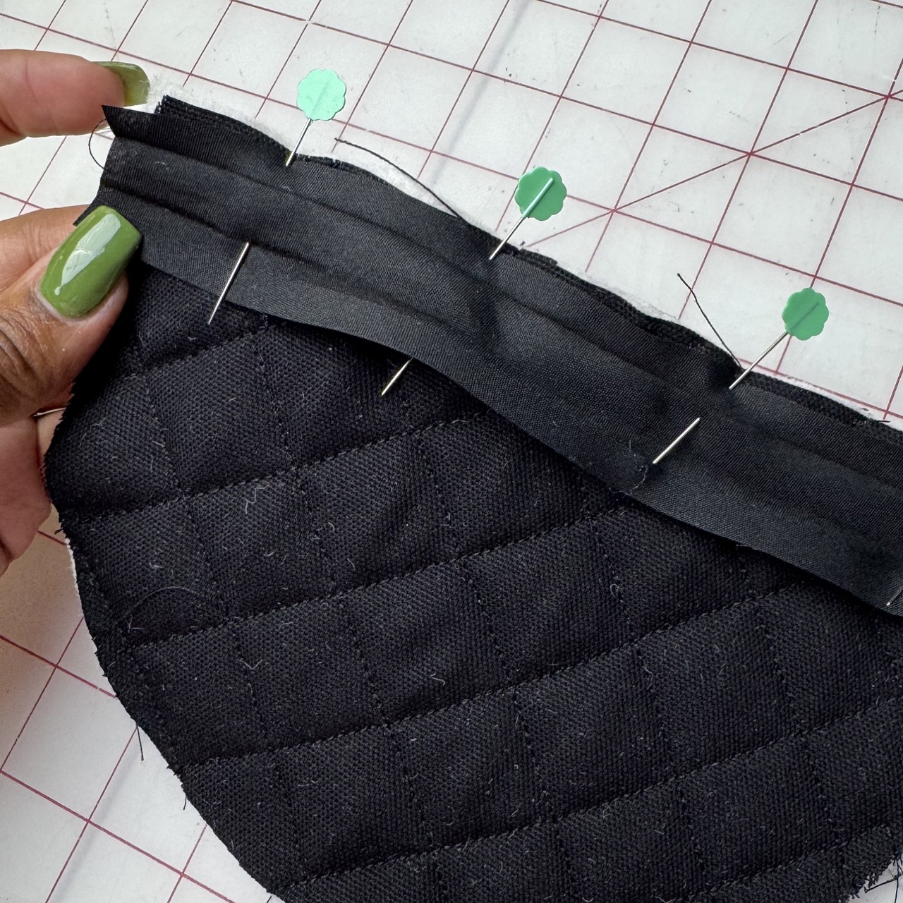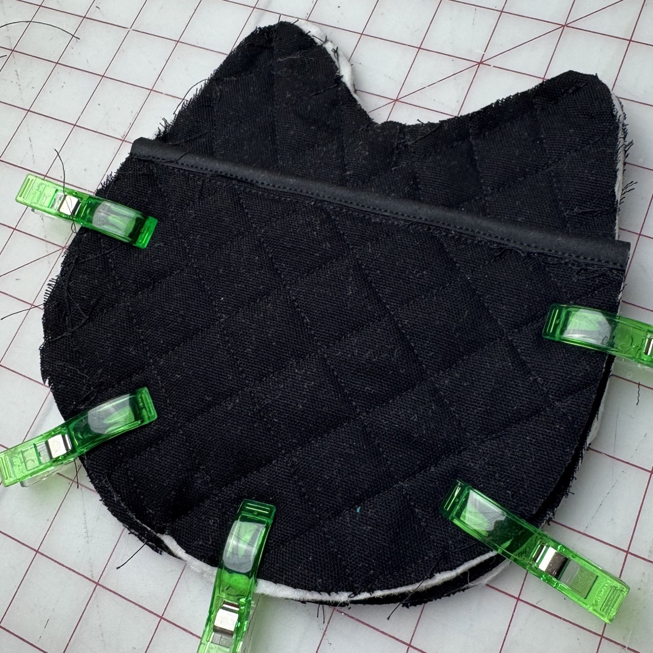 4) Sandwich the batting between both pieces of piece B. Add a quilt stitch to it. Add the double fold bias tape to the flat edge of piece B. Sandwich the batting between the black cat pieces. Then place piece B to the back of the piece A. Make sure all edges align neatly. Secure the layers with Clover Wonder Clips or Clover Flower Pins around the edges to prevent shifting while sewing.