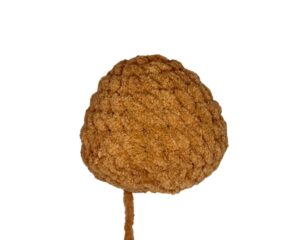 Pumpkin Hat: Sew the stem onto the center of the hat and secure a double knot on the opposite side. Cut the yarn tails short. Then, sew the hat onto the center of the head, weaving through the “third loop” of each st.