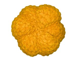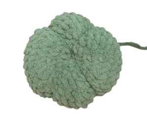 *Note: At this point, your pumpkin may look like a ball! Before you begin the next few steps, it’s important to understand the construction of the pumpkin segments. We will be using the yarn tail left at the end of the pumpkin to create symmetrical lines on the pumpkin. Cinching each segment evenly will help create the beautiful segments. There will be 6 in total.
