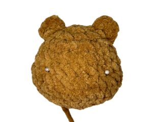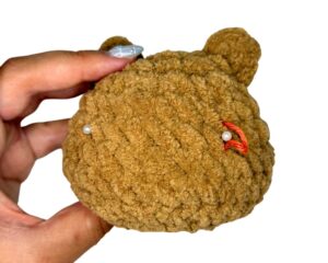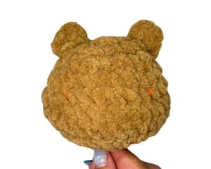 Using the Clover Darning Needle, thread the bear head’s yarn tail. Weave through the flo and pull the hole closed.