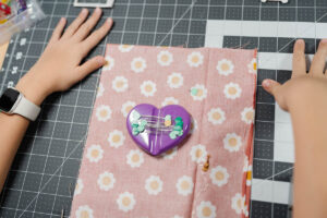 To keep the layers from shifting, she used her Heart-Shaped Pins to secure the fabrics together inside the seam allowance and Wonder Clips around the outer edge for extra hold.