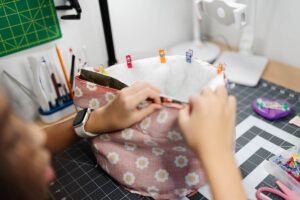 Using her Magnet Pin Caddy to keep everything organized, she sewed carefully around the entire top rim.