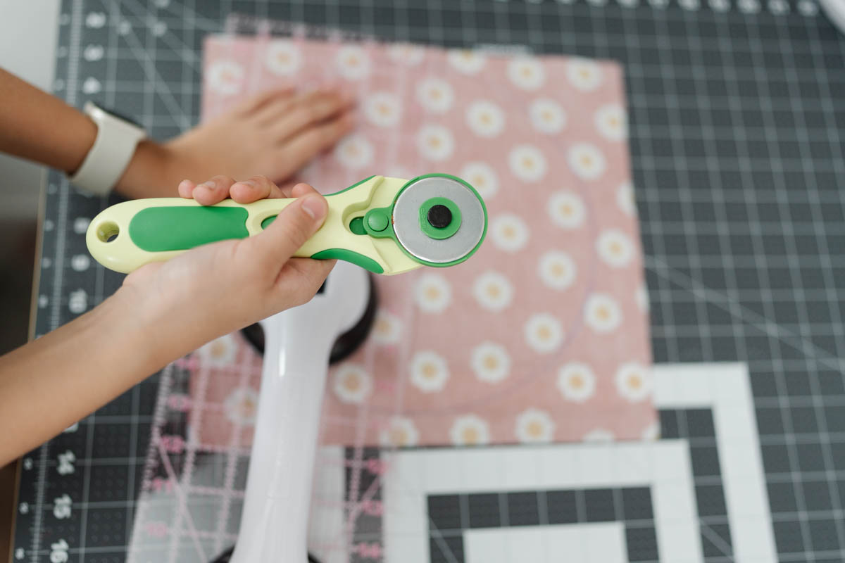 Using her Rotary Cutter and Hot Ruler, Cataleya cut both fabric rectangles (31½” × 9¼”) and two 10″ circles for the base.