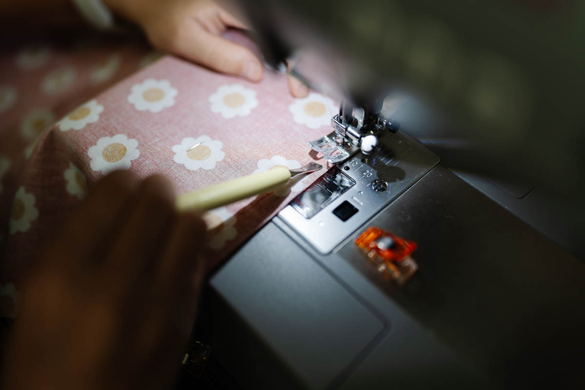 Sew slowly around the curve, using the Metal Hera to help guide the fabric smoothly under the feed dogs and keep the seam even.