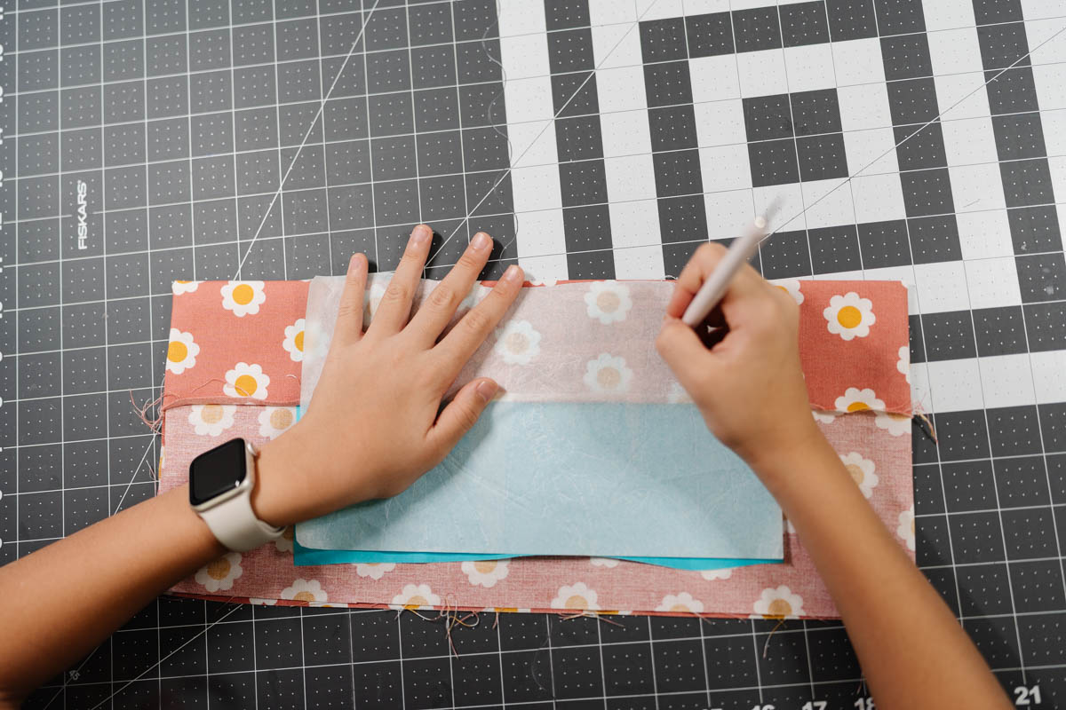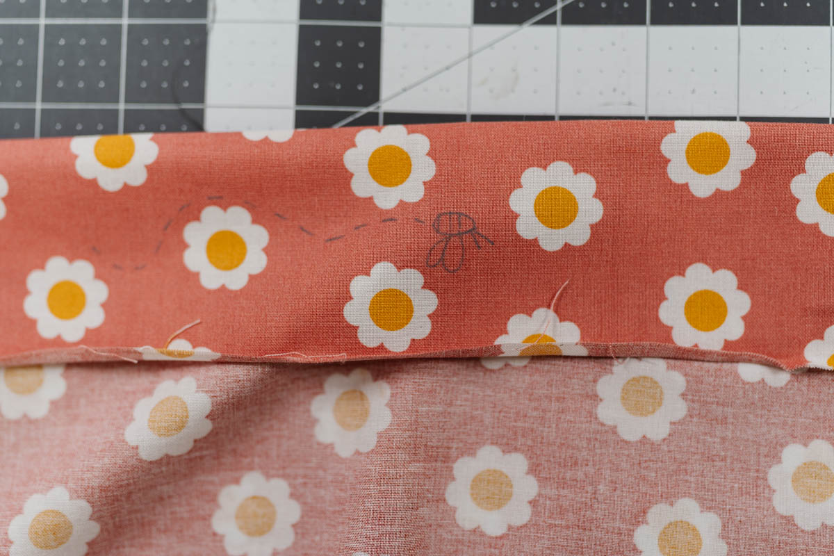 Then grab the inner fabric tube and repeat the same steps. Before attaching the base, she used her Hot Ruler to fold down 2½” from the top edge and pressed it in place. This fold became her guide for a small decorative touch — her signature buzzing bee.