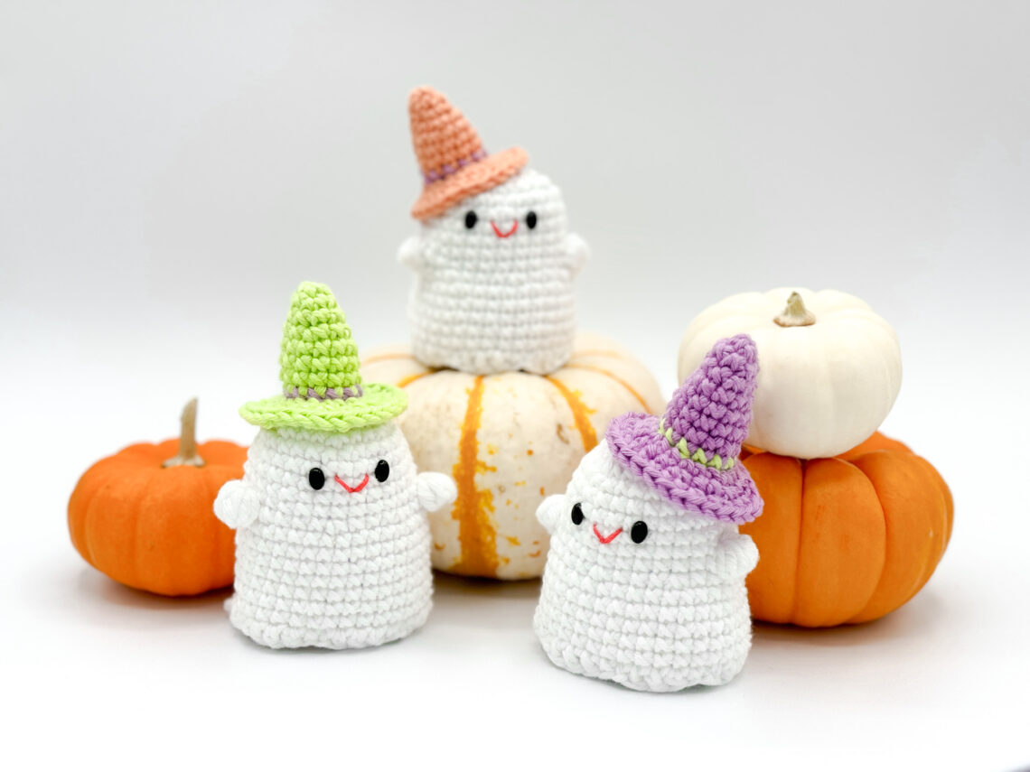 BOO! It’s me, your next project 😉 These little mini ghosts use battery-operated candle tea-lights to bring more fun to your Halloween decor! (hint: scroll all the way down to see the magic happen….) -Amy (@curiouspapaya on IG) MATERIALS: Amour Crochet 2.75mm Hook C #3 Light Worsted Cotton Yarn (here, I’m using Hobbii Friends Cotton 8/8 which offers more structure than flimsy soft yarns). White A combination of any 2 contrast colors: Pastel Green Pastel Orange Lavender Coral-colored embroidery thread 6 mm x 8 mm Oval Safety Eyes Mini…