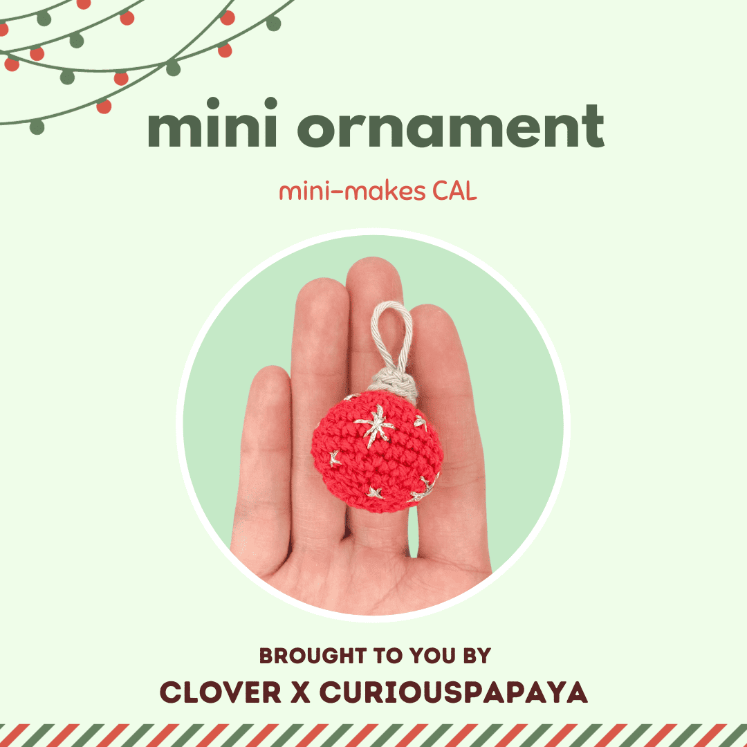 The holiday cheer is in full swing with Christmas only being a couple of weeks away! We invite you to join us for our Mini-Makes crochet-along from December 6-21. Read the blog post HERE for all of the details including the fun prizes our participants could win. Our very first pattern is this MINI ORNAMENT! Time: ~45 min. NOTES Please do not copy/redistribute any part of this pattern as your own. This includes reposting/translating without permission. Tag your creations with #cloversquad and #curiouspapaya so we can feature you!…