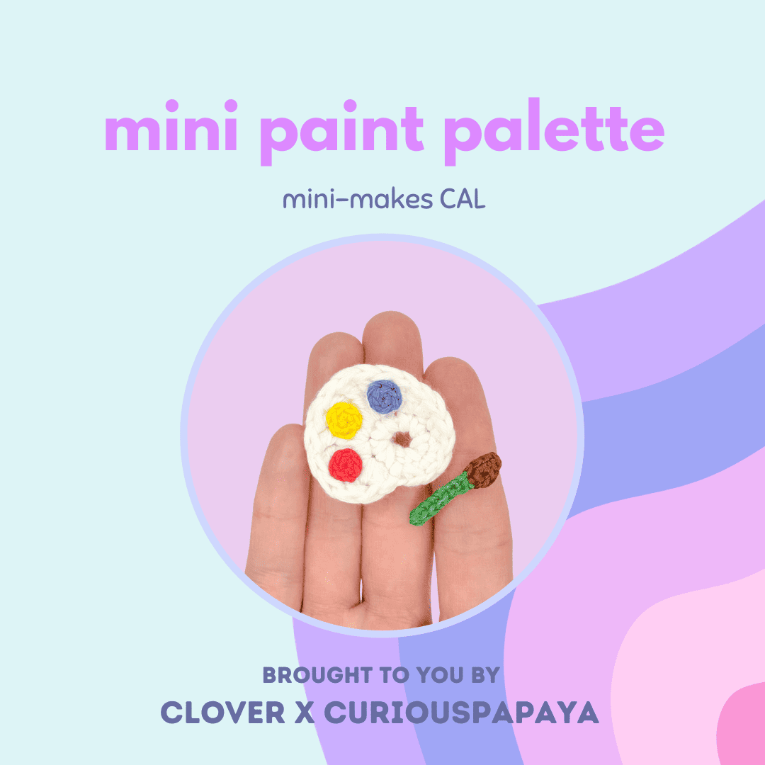 The holiday cheer is in full swing with Christmas only being a couple of weeks away! We invite you to join us for our crochet-along event from December 6-21. Read the blog post HERE for all of the details including the fun prizes we will be offering for our participants. Our third pattern is this MINI PAINT PALETTE! Time: ~1 hr. NOTES Please do not copy/redistribute any part of this pattern as your own. This includes reposting/translating without permission. Tag your creations with #cloversquad and #curiouspapaya so…