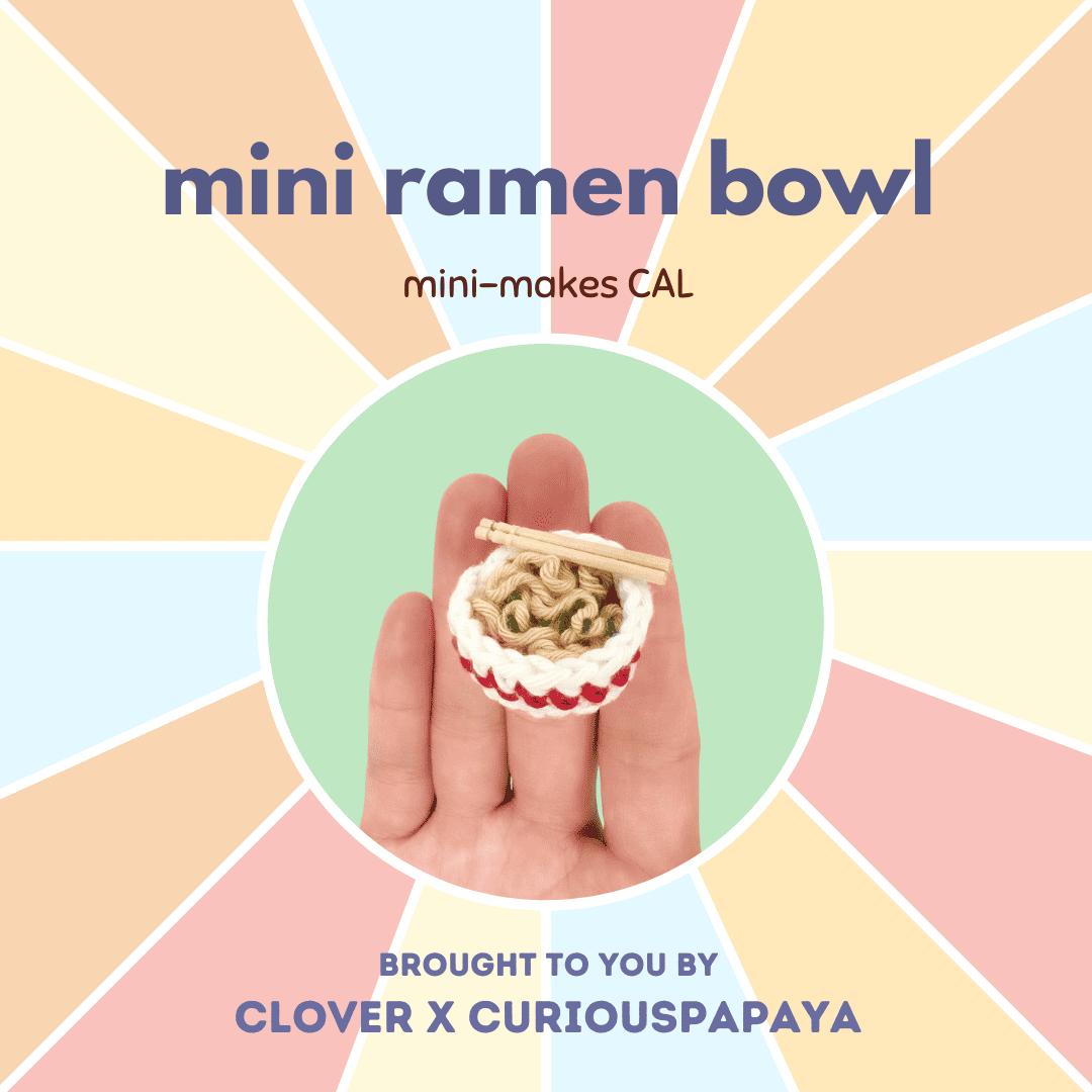 The holiday cheer is in full swing with Christmas only being a couple of weeks away! We invite you to join us for our crochet-along event from December 6-21. Read the blog post HERE for all of the details including the fun prizes we will be offering for our participants. Our fifth and FINAL pattern is this MINI RAMEN BOWL! Time: ~30 min. NOTES Please do not copy/redistribute any part of this pattern as your own. This includes reposting/translating without permission. Tag your creations with #cloversquad and…